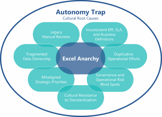 In this illustration, Excel Anarchy sits entirely within the Autonomy Trap, fully contained, but not representative of its full extent. Addressing spreadsheet misuse may relieve pain points, but lasting progress requires confronting the culture itself: rebalancing autonomy with governance, shared infrastructure, and strategic alignment.